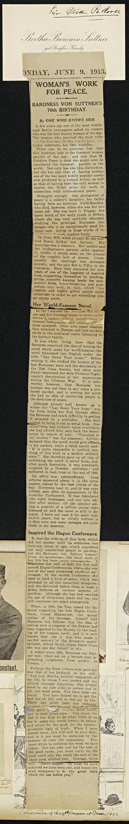 The subscription only Gerritsen Collection of Aletta Jacobs has numerous articles on Bertha von Suttner in German. A few are in English. A free trial of the database can be arranged if your library subscribes to a ProQuest database. In rare cases, a trial will be set up for an individual. Click here for more information. The Gerritsen Collection is the greatest single source for women's history in the world.